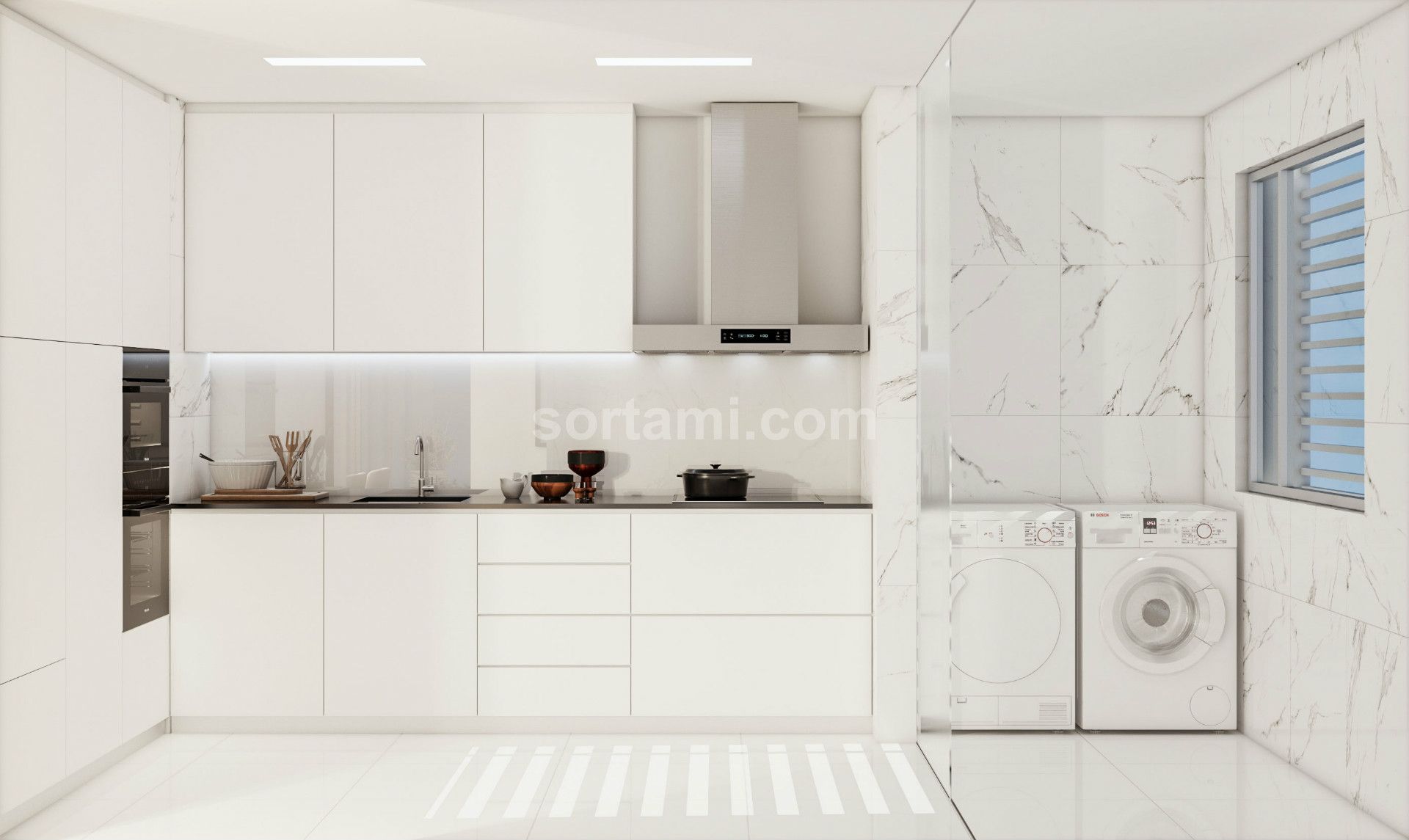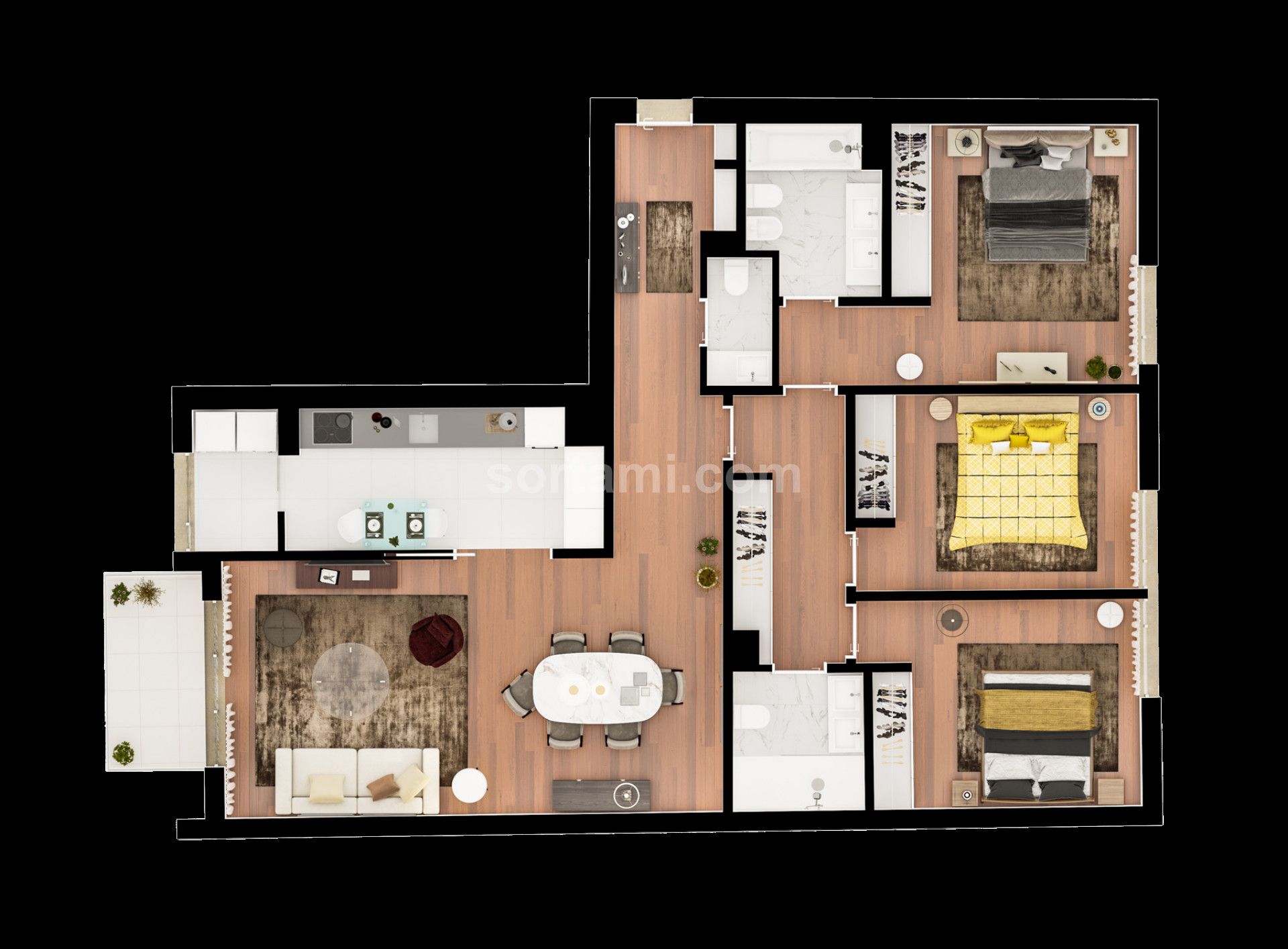 This magnificent apartment consists of a large living room with balcony, kitchen with laundry, three bedrooms, from which two en suite and a service bathroom.