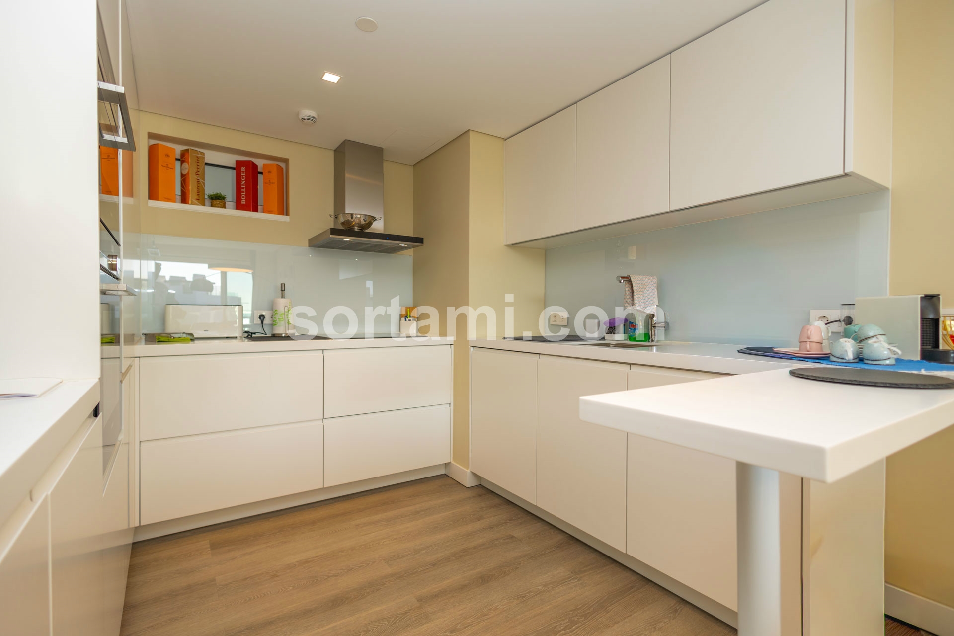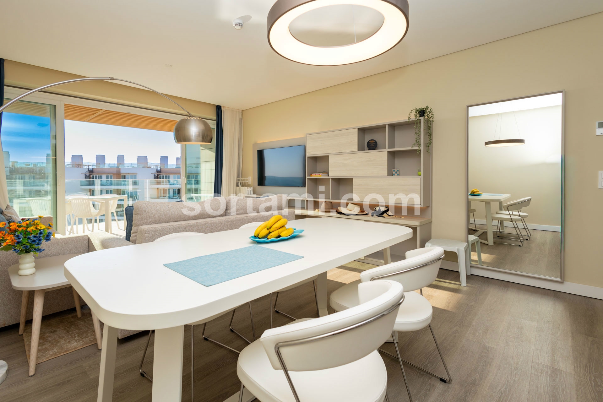 It comprises two bedrooms, which of one en-suite with access to a balcony with sea view, a large living- and dining room with plenty of natural light, an open space equipped kitchen and one bathroom for guests.